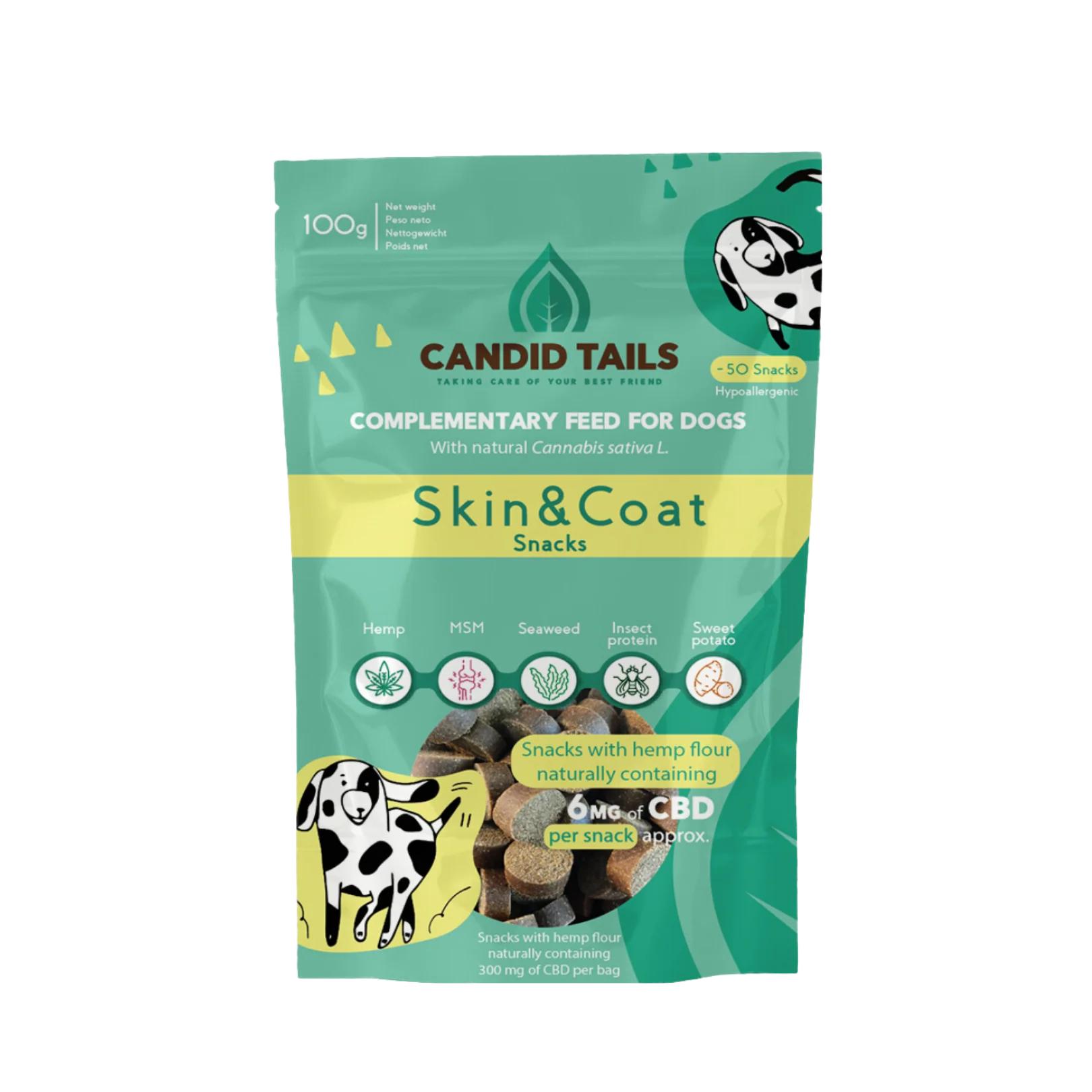 CandidTails Skin & Coat CBD Snacks are complementary feeding treats formulated to support skin health and coat condition in dogs. Each snack contains approximately 6mg of naturally derived CBD from hemp, combined with carefully selected ingredients designed to support skin comfort and overall wellbeing.